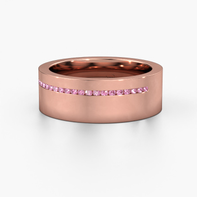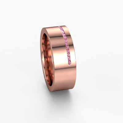 A truly stylish 14 Carat modern wedding ring! This exquisite ladies wedding ring, as shown above, is set with round pink sapphire. Our goldsmiths make each rose gold wedding ring by hand in our own artisan studio and because of that, the pink sapphire are set with the utmost precision. This causes light to reflect evenly from every angle of the pink sapphire. The width of this modern WH0143L17BP wedding ring is ±0.28 in (7 mm) and the finish is shiny. The jewel designer, member of a specialized team, will make a graphic 3D design of your wedding ring. If it pleases you, you can also order a ring dummy so you can try it on and see your ring before creation. Subsequently, our goldsmith will create your unique wedding ring with great care in our own crafting studio. A meticulous job, because both creating as well as finishing your ring requires a keen eye. And that is what makes our craft special. Your unique wedding ring is the result of true passionate craftsmanship!Be inspired by our designs, and adjust this wedding ring to your own personal taste: wider or smaller, shiny or matte? No problem! Even if you have ideas of your own for special wedding rings, our jewelry designers are lined up to help you design the ring of your dreams. don't hesitate to contact us!After receiving your order, our goldsmiths will passionately start the creative process of making your wedding rings in our own artisan studio. Because we do not maintain a large stockpile, we can offer our jewelry at a lower price than other jewelers. Our pricing is proof of that! We offer top quality jewels at lowest price, guaranteed.To make it easier for you, we offer a 30 day return policy. Check our terms and conditions.