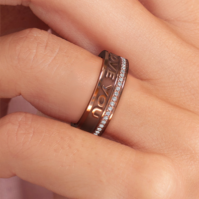 This ladies wedding ring with a personal inscription is a truly unique wedding ring. A personal text, words with meaning, is what makes this a truly unique personal item. Part of lyrics to a special song, a special word or the name of a loved one. Make your rose gold wedding ring as personal as possible. More regarding a personal engraving can be found in our databank, at the bottom of this page. This Namering 2 wedding ring for ladies has a width of ±0.24 in (6 mm). Choosing a wedding ring is not done on a whim. In the end, you want a ring that completely matches your style and preferences. A reflection of your love and relationship. A ring to last a lifetime. A symbol of all that unites you. Creating your dream ring is what gets us excited. This is artfully done by hand in our own crafting studio, so we can create your ring to perfection. The most rewarding job in the world!Do you have special preferences regarding your wedding ring? For instance, a smaller or a wider band? Or perhaps a shiny or a matte ring? There are numerous variations possible. You can always discuss the possibilities with our jewelry designers. If you have certain wedding rings in mind, our designers will gladly help by drawing the rings of your dreams. Be sure to contact us!Because we design our wedding rings ourselves, and deliver it directly to you, we can offer you wedding rings at a price you won't find anywhere else. Our rings are made to order, which helps prevent excess supplies, so we can make you a great price offer.To make it easier for you, we offer a 30 day return policy. Check our terms and conditions.