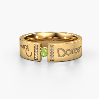 A unique wedding ring with peridot! What makes this ladies wedding ring WH2094L16C special, is that you can have it engraved with a special text, which has meaning to you. A word, a short phrase or part of the lyrics to a song. Whichever text is most meaningful to you. Memorialize it as an exquisite engravement on this modern wedding ring. This own Text ladies wedding ring has an ±0.24 in (6 mm) width. You can choose the combination of precious metals of your preference in our online tool. Anything goes! It is wise to browse through the characteristics of each different precious metal. For example, gold and silver are softer metals. Carat is determined by the amount of added extra metals. If the goldsmith doesn't add a lot, carat is higher and the wedding ring will be softer. If he adds more metals, the jewel has a lower amount of carat. A softer precious metal can still be used for your modern wedding ring! If you prefer a precious metal which will last a lifetime, we recommend platinum. This is the most solid and durable metal our goldsmith uses.This wedding ring can also serve as a source of inspiration. Would you like the ring to have a matte or shiny finish (at no additional cost), or would you prefer it to be wider or narrower? Anything is possible. Because there are countless variations, we can’t show everything on our website. Do you have an idea for beautiful wedding rings, or have you seen a stunning set of wedding rings elsewhere? Feel free to contact us; our designers are ready to assist you.By combining our modern techniques with ancient crafting, we can design and customize the finest quality jewels with the utmost care for you at the best price. Our wedding rings are always priced 30% lower than those of other jewelers. We make wedding rings to order so we don't have to maintain a large stock.To make it easier for you, we offer a 30 day return policy. Check our terms and conditions.