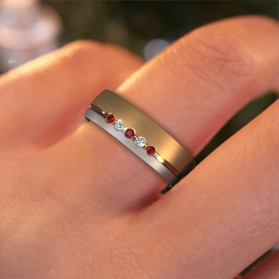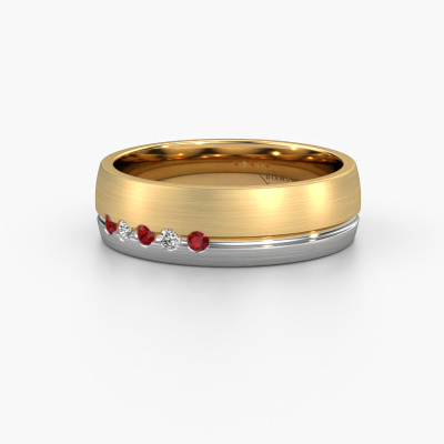 What a perfect combination of two different precious metals. They seem to reinforce each other in the traditional design of this ring! Our goldsmith would be honored to create a unique ring for you, customized to your liking. Each ladies wedding ring we offer is artfully crafted by hand in our own artisan studio. That makes it possible for us to turn traditional into reality and helps create your own personal ring, customized to your style. This traditional WH0323L25AM ladies wedding ring is set with round ruby, is ±0.24 in (6 mm) wide and has a matte finish. Simply customize your gemstones and colors with our online tool. Our jewel designers will make a 3D drawing of your design, so you can see the result. Our goldsmiths will subsequently make your wedding ring by hand, according ancient craftsmanship. Our goal is to make the wedding ring you have in mind. A unique wedding ring to match your style completely!Do you have specific wishes regarding your wedding ring, but are you having difficulties finding the design on our website? The be sure to contact our designers! For instance, we can make the band smaller or wider. Do you prefer a matte finish? We can do that! Engravings are a great way of personalizing your rings, and applicable on most designs. Or, if you have an idea of your own for your extraordinary wedding rings, contact us! Our designers are up for the challenge of designing the ring of your dreams!By combining our modern techniques with ancient crafting, we can design and customize the finest quality jewels with the utmost care for you at the best price. Our wedding rings are always priced 30% lower than those of other jewelers. We make wedding rings to order so we don't have to maintain a large stock.To make it easier for you, we offer a 30 day return policy. Check our terms and conditions.