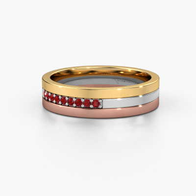 An extraordinary memoire white gold ladies wedding ring! The combination of the three different precious metals represents your unique love. Isn't that wonderful? Our goldsmith will create your ring in our own crafting studio. With a unique combination of pure craftsmanship of goldsmiths and the most modern techniques, we are able to customize your modern three tone wedding ring to perfection. This 3 color WH0413L15AP wedding ring set with round ruby is ±0.20 in (5 mm) wide and has a shiny finish. Simply customize your gemstones and colors with our online tool. Our jewel designers will make a 3D drawing of your design, so you can see the result. Our goldsmiths will subsequently make your wedding ring by hand, according ancient craftsmanship. Our goal is to make the wedding ring you have in mind. A unique wedding ring to match your style completely!Do you have special preferences regarding your wedding ring? For instance, a smaller or a wider band? Or perhaps a shiny or a matte ring? There are numerous variations possible. You can always discuss the possibilities with our jewelry designers. If you have certain wedding rings in mind, our designers will gladly help by drawing the rings of your dreams. Be sure to contact us!By combining our modern techniques with ancient crafting, we can design and customize the finest quality jewels with the utmost care for you at the best price. Our wedding rings are always priced 30% lower than those of other jewelers. We make wedding rings to order so we don't have to maintain a large stock.To make it easier for you, we offer a 30 day return policy. Check our terms and conditions.