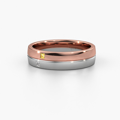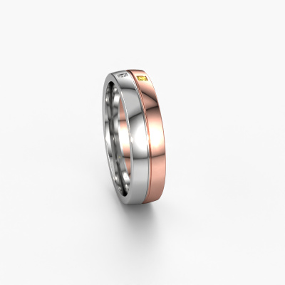 What a perfect combination of two different precious metals. They seem to reinforce each other in the modern design of this ring! Our goldsmith would be honored to create a unique ring for you, customized to your liking. Each ladies wedding ring we offer is artfully crafted by hand in our own artisan studio. That makes it possible for us to turn modern into reality and helps create your own personal ring, customized to your style. This modern WH0231L25BP ladies wedding ring is set with princess yellow sapphire, is ±0.20 in (5 mm) wide and has a shiny finish. After designing your ring, our jewel designer will start working on it. He will make a graphic 3D design of your wedding ring. This can also be used to make a dummy ring. Simply order a dummy ring and see for yourself how your ring will turn out. Subsequently, our expert goldsmith will create your ring in our own artisan studio. We use eco-friendly gold, so you get a ring, we are proud of, which looks good inside and out. You can also send us your own gold. Because we create your ring by hand, we can use your own gold. Our goal is to create an exquisite sparkling wedding ring just as envisioned it!Do you have special preferences regarding your wedding ring? For instance, a smaller or a wider band? Or perhaps a shiny or a matte ring? There are numerous variations possible. You can always discuss the possibilities with our jewelry designers. If you have certain wedding rings in mind, our designers will gladly help by drawing the rings of your dreams. Be sure to contact us!After receiving your order, our goldsmiths will start the creative process of making your wedding rings. We don't keep stock. This is advantageous because these costs will not be passed on to you. Therefore, our quality wedding rings are always priced 30 percent lower than those of other jewelers.To make it easier for you, we offer a 30 day return policy. Check our terms and conditions.