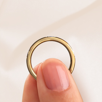 This exclusive ladies wedding ring is a melting pot of ancient craftsmanship, love, passion and the latest techniques. It requires a keen eye, patience and a skillful hand to create this gold wedding ring to perfection. And perfection is what our goldsmiths strive for! This way, you create an exclusive ring, which is customized to your liking and made by hand in our own artisan studio. This exclusive WH0139L25BP wedding ring is set with sapphire 2.5 mm, is ±0.20 in (5 mm) wide and has a mat/shiny finish. After designing your ring, our jewel designer will start working on it. He will make a graphic 3D design of your wedding ring. This can also be used to make a dummy ring. Simply order a dummy ring and see for yourself how your ring will turn out. Subsequently, our expert goldsmith will create your ring in our own artisan studio. We use eco-friendly gold, so you get a ring, we are proud of, which looks good inside and out. You can also send us your own gold. Because we create your ring by hand, we can use your own gold. Our goal is to create an exquisite sparkling wedding ring just as envisioned it!Do you have specific wishes regarding your wedding ring, but are you having difficulties finding the design on our website? The be sure to contact our designers! For instance, we can make the band smaller or wider. Do you prefer a matte finish? We can do that! Engravings are a great way of personalizing your rings, and applicable on most designs. Or, if you have an idea of your own for your extraordinary wedding rings, contact us! Our designers are up for the challenge of designing the ring of your dreams!Because we design and deliver our own wedding rings, we can offer you wedding rings at a price you won't find anywhere else. A ring is made to order, which helps prevent excess supplies, so we can make you a great price offer.To make it easier for you, we offer a 30 day return policy. Check our terms and conditions.