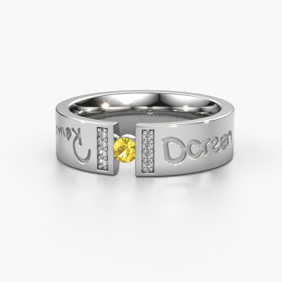 A unique wedding ring with yellow sapphire! What makes this ladies wedding ring WH2094L16C special, is that you can have it engraved with a special text, which has meaning to you. A word, a short phrase or part of the lyrics to a song. Whichever text is most meaningful to you. Memorialize it as an exquisite engravement on this modern wedding ring. This own Text ladies wedding ring has an ±0.24 in (6 mm) width. You can choose the combination of precious metals of your preference in our online tool. Anything goes! It is wise to browse through the characteristics of each different precious metal. For example, gold and silver are softer metals. Carat is determined by the amount of added extra metals. If the goldsmith doesn't add a lot, carat is higher and the wedding ring will be softer. If he adds more metals, the jewel has a lower amount of carat. A softer precious metal can still be used for your modern wedding ring! If you prefer a precious metal which will last a lifetime, we recommend platinum. This is the most solid and durable metal our goldsmith uses.This wedding ring can also serve as a source of inspiration. Would you like the ring to have a matte or shiny finish (at no additional cost), or would you prefer it to be wider or narrower? Anything is possible. Because there are countless variations, we can’t show everything on our website. Do you have an idea for beautiful wedding rings, or have you seen a stunning set of wedding rings elsewhere? Feel free to contact us; our designers are ready to assist you.By combining our modern techniques with ancient crafting, we can design and customize the finest quality jewels with the utmost care for you at the best price. Our wedding rings are always priced 30% lower than those of other jewelers. We make wedding rings to order so we don't have to maintain a large stock.To make it easier for you, we offer a 30 day return policy. Check our terms and conditions.