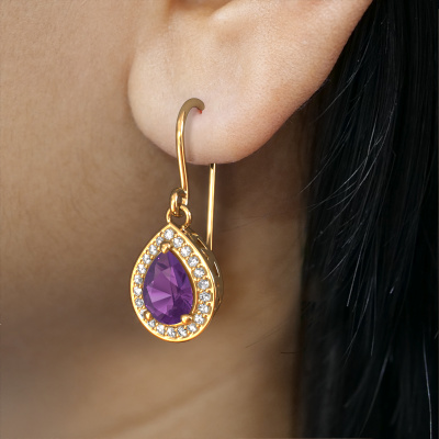 This is our set of trendy Beverlee 1 drop earrings. In this example the drop earrings are set with pear amethyst. Each of our amethysten gemstones is carefully selected and positioned in your drop earrings with great precision so light hits the amethyst from every angle. We believe these drop gold drop earrings look best set with colored gemstones. But that is entirely up to you. Our goldsmiths passionately create your customized drop earrings to your liking with the utmost care. The gold set drop earrings, as shown here, can be customized using our online tool. Feel free to ask our jewel designers for assistance if you want changes made which are unavailable in our online tool. We are happy to answer your questions.After receiving your order, our goldsmiths will passionately start the creative process of making your drop earrings in our own studio. Because we don't have a big stockpile, these costs will not be passed on to you. Our pricing is proof of that! We offer top quality jewels at lowest price, guaranteed.To make it easier for you, we offer a 30 day return policy. Check our terms and conditions.