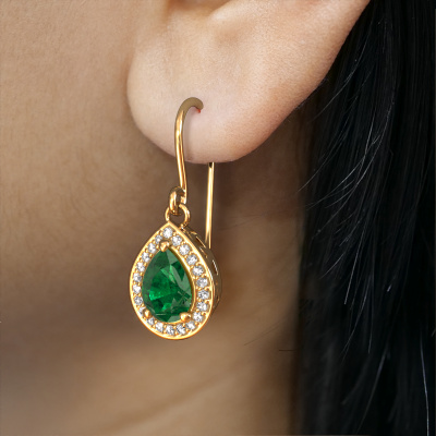 This is our set of trendy Beverlee 1 drop earrings. In this example the drop earrings are set with pear emerald. Each of our emeralds gemstones is carefully selected and positioned in your drop earrings with great precision so light hits the emerald from every angle. We believe these drop gold drop earrings look best set with colored gemstones. But that is entirely up to you. Our goldsmiths passionately create your customized drop earrings to your liking with the utmost care. The gold set drop earrings, as shown here, can be customized using our online tool. Feel free to ask our jewel designers for assistance if you want changes made which are unavailable in our online tool. We are happy to answer your questions.After receiving your order, our goldsmiths will passionately start the creative process of making your drop earrings in our own studio. Because we don't have a big stockpile, these costs will not be passed on to you. Our pricing is proof of that! We offer top quality jewels at lowest price, guaranteed.To make it easier for you, we offer a 30 day return policy. Check our terms and conditions.