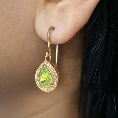 This is our set of trendy Beverlee 1 drop earrings. In this example the drop earrings are set with pear peridot. Each of our peridot gemstones is carefully selected and positioned in your drop earrings with great precision so light hits the peridot from every angle. We believe these drop gold drop earrings look best set with colored gemstones. But that is entirely up to you. Our goldsmiths passionately create your customized drop earrings to your liking with the utmost care. The gold set drop earrings, as shown here, can be customized using our online tool. Feel free to ask our jewel designers for assistance if you want changes made which are unavailable in our online tool. We are happy to answer your questions.After receiving your order, our goldsmiths will passionately start the creative process of making your drop earrings in our own studio. Because we don't have a big stockpile, these costs will not be passed on to you. Our pricing is proof of that! We offer top quality jewels at lowest price, guaranteed.To make it easier for you, we offer a 30 day return policy. Check our terms and conditions.