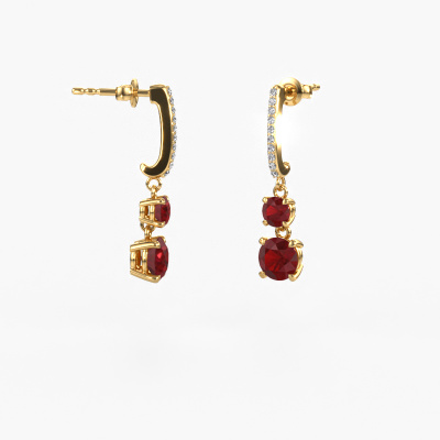What could possibly be more stunning than a pair of stunning drop earrings? These gold Tanja 2 drop earrings are a true eye-catcher. These hanging drop earrings are set with round ruby. We collaborate with the best suppliers of gemstones and they select our gemstones with great care. Your drop earrings are made by hand in our own artisan studio by our expert goldsmiths. The best part of these hanging drop earrings is that you can customize it to your own liking. Your style, your choice, your drop earrings. On top of that, your exclusive gold drop earrings will be made by hand with eco-friendly materials! Please feel free to easily customize the drop earrings, using our online tool.Because we design and deliver our own drop earrings, we can offer you drop earrings at a price you won't find anywhere else. drop earrings are made to order, which helps prevent excess supplies, so we can make you a great price offer. We understand it feels risky, buying your drop earrings online, but we will gladly assist in the designing process, taking your budget into consideration.To make it easier for you, we offer a 30 day return policy. Check our terms and conditions.