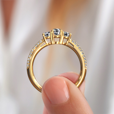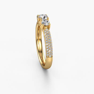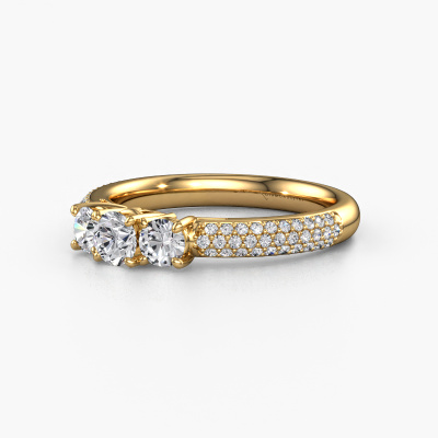 This 14 Carat gold ring is called Marielle RND and is set with 0.920 crt diamond. This exclusive gold 3-stone engagement ring is a true work of art! The ornaments are crafted with a lot of patience and great passion. In order to create this ring with great precision, this craft requires a keen eye and skillful hand. A challenge which ignites a fire in our expert goldsmith. The exquisite diamonds are set in a special way so they stand out even more. This gives the ring an even more glamorous appearance. The tasteful engagement ring is actually unique on its own because of the gemstones which we carefully select especially for this ring. On top of that you select the precious metals which will be used to create a unique ring for the most extraordinary woman in your life! This jewel is made with passion and love by one of our master goldsmiths.By using a combination of the latest modern techniques, combined with ancient crafting, we can make all our engagement rings in our own studio. Each jewel is made to order. This is advantageous because we can offer you a price you won't find anywhere else.Our designers and goldsmiths work together each day, creating new jewels. Perhaps you have found a nice exclusive engagement ring somewhere, which can be used to customize your unique ring. Please feel free to contact us. We will make you an offer, based on a fair price/ quality ratio, which will amaze you.To make it easier for you, we offer a 30 day return policy. Check our terms and conditions.