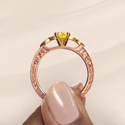 This 14 Carat rose gold ring is called Gillian and is set with 5 mm yellow sapphire. Is your girlfriend hooked on vintage? Then this rose gold ajour engagement ring will surely match her style perfectly. A trendy ring with just a hint of vintage adornment. A truly stunning, romantic design! Especially when you customize your ring to your own liking. This vintage 3-stone engagement ring is set with stunning yellow sapphire. As you can see, you are the boss in selecting a gemstone which matches the style of your girlfriend best. Each gemstone is carefully selected by our merchants whom are spread throughout the world. Nothing but the best gems for our expert goldsmith. After all, it is his crowning glory! Each jewel is made just for you, with attention to detail and design.After receiving your order, our goldsmiths will passionately start the creative process of making your engagement ring in our own studio. Because we don't have a big stockpile, these costs will not be passed on to you. Our pricing is proof of that! We offer top quality jewels at lowest price, guaranteed.Different styles of new rings are made daily by our team. Perhaps you have found a 3-stone engagement ring somewhere. One you would like to give to your loved one. Please feel free to share your thoughts and design with our jewel designers. We would love to turn your design into a vintage engagement ring. You can follow the development of your ring design because we use very detailed 3D drawings. On top of that, you can order a dummy of the design. A dummy is a plastic ring, which can be shaped according your ring design. You can try it on and check if the engagement ring is up to standard. We will gladly send you a non-binding offer, based on a fair price/ quality ratio. The offer will baffle you, considering the quality of the ring and gemstones.To make it easier for you, we offer a 30 day return policy. Check our terms and conditions.