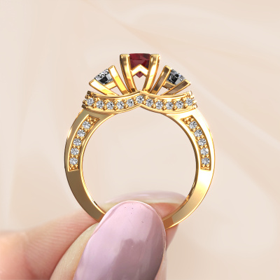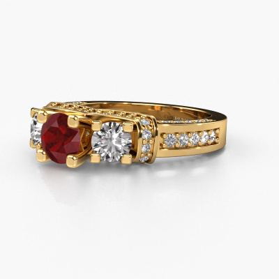 This 14 Carat gold ring is called Phileine and is set with 5 mm ruby. This exclusive gold 3-stone engagement ring is a true work of art! The ornaments are crafted with a lot of patience and great passion. In order to create this ring with great precision, this craft requires a keen eye and skillful hand. A challenge which ignites a fire in our expert goldsmith. The exquisite ruby are set in a special way so they stand out even more. This gives the ring an even more glamorous appearance. The daring engagement ring is actually unique on its own because of the gemstones which we carefully select especially for this ring. On top of that you select the precious metals which will be used to create a unique ring for the most extraordinary woman in your life! This jewel is made with passion and love by one of our master goldsmiths.After receiving your order, our goldsmiths will passionately start the creative process of making your engagement ring in our own studio. Because we don't have a big stockpile, these costs will not be passed on to you. Our pricing is proof of that! We offer top quality jewels at lowest price, guaranteed.Different styles of new rings are made daily by our team. Perhaps you have found a 3-stone engagement ring somewhere. One you would like to give to your loved one. Please feel free to share your thoughts and design with our jewel designers. We would love to turn your design into a exclusive engagement ring. You can follow the development of your ring design because we use very detailed 3D drawings. On top of that, you can order a dummy of the design. A dummy is a plastic ring, which can be shaped according your ring design. You can try it on and check if the engagement ring is up to standard. We will gladly send you a non-binding offer, based on a fair price/ quality ratio. The offer will baffle you, considering the quality of the ring and gemstones.To make it easier for you, we offer a 30 day return policy. Check our terms and conditions.