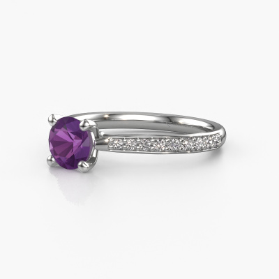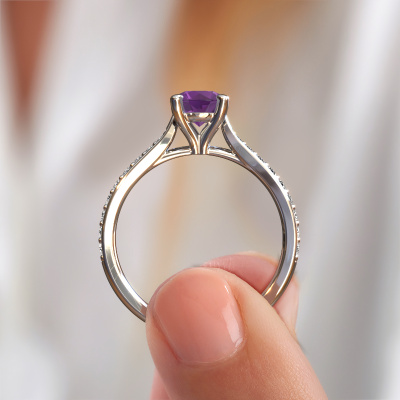 The ring shown above is called the Mignon rnd 2. We call this type of ring a pavé solitaire ring because it has one center gemstone and a band that is also pave set with gemstones. The platinum engagement ring is set with a round 6 mm amethyst center stone and the band is pave set with lab-grown diamond gemstones. Each jewel is made by a team of passionate goldsmiths and jewel designers. This will make your crown jewel truly eye-catching.This luxury platinum pavé solitaire engagement ring has an exquisite round amethyst center stone. To further accentuate the center stone, the band is fully set with more lab grown diamonds. Its open prong setting allows light to strike the amethyst from various angles and this adds sparkle to your amethyst ring. The photo shown above depicts the goldsmith's carefully handcrafted details of the ring. The high positioning of the center stone is truly eye-catching. The perfect engagement ring for the crown jewel of your life! By using our modern techniques, we can design and customize the finest quality jewels with the utmost care for you. Our engagement rings are always priced 30 percent lower than other jewelers. We make engagement rings to order so we don't have to maintain a large stock. If you have a certain budget, we are more than happy to advice you accordingly.Different styles of new rings are made daily by our team. Perhaps you have found a pavé solitaire engagement ring somewhere. One you would like to give to your loved one. Please feel free to share your thoughts and design with our jewel designers. We would love to turn your design into a luxury engagement ring. You can follow the development of your ring design because we use very detailed 3D drawings. On top of that, you can order a dummy of the design. A dummy is a plastic ring, which can be shaped according your ring design. You can try it on and check if the engagement ring is up to standard. We will gladly send you a non-binding offer, based on a fair price/ quality ratio. The offer will baffle you, considering the quality of the ring and gemstones.To make it easier for you, we offer a 30 day return policy. Check our terms and conditions.