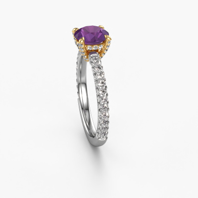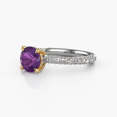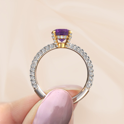 The ring shown above is called the Saskia rnd 2. We call this type of ring a pavé solitaire ring because it has one center gemstone and a band that is also pave set with gemstones. The 14 Carat white gold engagement ring is set with a round 7 mm amethyst center stone and the band is pave set with lab-grown diamond gemstones. Each jewel is made by a team of passionate goldsmiths and jewel designers. This will make your crown jewel truly eye-catching.This exclusive white gold pavé solitaire engagement ring has an exquisite round amethyst center stone. To further accentuate the center stone, the band is fully set with more lab grown diamonds. Its open prong setting allows light to strike the amethyst from various angles and this adds sparkle to your amethyst ring. The photo shown above depicts the goldsmith's carefully handcrafted details of the ring. The high positioning of the center stone is truly eye-catching. The perfect engagement ring for the crown jewel of your life! After receiving your order, our goldsmiths will passionately start the creative process of making your engagement ring in our own studio. Because we don't have a big stockpile, these costs will not be passed on to you. Our pricing is proof of that! We offer top quality jewels at lowest price, guaranteed.Our team adds new designs to our online collection daily. Our designers and goldsmiths work together in creating the best design. We strive to offer a diverse collection of jewels. Perhaps you have a specific jewel design in mind. One you came across somewhere. Please contact us for a free consultation. We will make you an offer, based on a fair price/ quality ratio, that will baffle you.To make it easier for you, we offer a 30 day return policy. Check our terms and conditions.