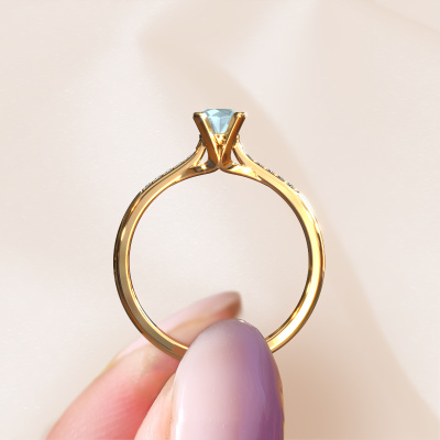 The ring shown above is called the Isa 2. We call this type of ring a pavé solitaire ring because it has one center gemstone and a band that is also pave set with gemstones. This engagement ring is made in 14 Carat gold set with a 4.2 mm round aquamarine, and pave set diamonds at the sides. Each piece of jewelry is created to add sparkle to your finger, each jewel is lovingly made by hand by our goldsmiths.This classic gold pavé solitaire engagement ring has an exquisite round aquamarine center stone. To further accentuate the center stone, the band is set full with more diamonds. Its open prong setting allows light to strike the aquamarine from various angles and this adds sparkle to your aquamarine ring. The photo shown above depicts the goldsmith's carefully handcrafted details of the ring. The high positioning of the center stone is truly eye-catching. The perfect engagement ring for the crown jewel of your life!After receiving your order, our goldsmiths will passionately start the creative process of making your engagement ring in our own studio. Because we don't have a big stockpile, these costs will not be passed on to you. Our pricing is proof of that! We offer top quality jewels at lowest price, guaranteed.Different styles of new rings are made daily by our team. Perhaps you have found a pavé solitaire engagement ring somewhere. One you would like to give to your loved one. Please feel free to share your thoughts and design with our jewel designers. We would love to turn your design into a classic engagement ring. You can follow the development of your ring design because we use very detailed 3D drawings. On top of that, you can order a dummy of the design. A dummy is a plastic ring, which can be shaped according your ring design. You can try it on and check if the engagement ring is up to standard. We will gladly send you a non-binding offer, based on a fair price/ quality ratio. The offer will baffle you, considering the quality of the ring and gemstones.To make it easier for you, we offer a 30 day return policy. Check our terms and conditions.