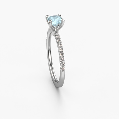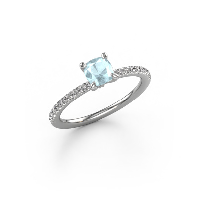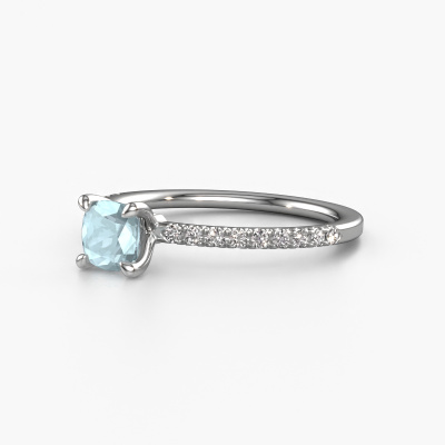 The ring shown above is called the Crystal CUS 2. We call this type of ring a pavé solitaire ring because it has one center gemstone and a band that is also pave set with gemstones. The platinum engagement ring is set with a cushion 5 mm aquamarine center stone and the band is pave set with diamond gemstones. Each jewel is made just for you by our master goldsmiths in our own studio.This classic platinum pavé solitaire engagement ring has an exquisite cushion aquamarine center stone. To further accentuate the center stone, the band is fully set with more diamonds. Its open prong setting allows light to strike the aquamarine from various angles and this adds sparkle to your aquamarine ring. The photo shown above depicts the goldsmith's carefully handcrafted details of the ring. The high positioning of the center stone is truly eye-catching. The perfect engagement ring for the crown jewel of your life! After receiving your order, our goldsmiths will start the creative process of making your Crystal CUS 2 engagement ring. We don't keep stock. This is advantageous because these costs will not be passed on to you. Therefore, we can offer jewelry at exceptionally low prices.Different styles of new rings are made daily by our team. Perhaps you have found a pavé solitaire engagement ring somewhere. One you would like to give to your loved one. Please feel free to share your thoughts and design with our jewel designers. We would love to turn your design into a classic engagement ring. You can follow the development of your ring design because we use very detailed 3D drawings. On top of that, you can order a dummy of the design. A dummy is a plastic ring, which can be shaped according your ring design. You can try it on and check if the engagement ring is up to standard. We will gladly send you a non-binding offer, based on a fair price/ quality ratio. The offer will baffle you, considering the quality of the ring and gemstones.To make it easier for you, we offer a 30 day return policy. Check our terms and conditions.