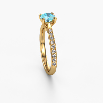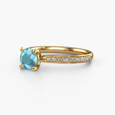 The ring shown above is called the Mignon rnd 2. We call this type of ring a pavé solitaire ring because it has one center gemstone and a band that is also pave set with gemstones. The 14 Carat gold engagement ring is set with a round 6 mm blue topaz center stone and the band is pave set with lab-grown diamond gemstones. Each jewel is made by a team of passionate goldsmiths and jewel designers. This will make your crown jewel truly eye-catching.This luxury gold pavé solitaire engagement ring has an exquisite round blue topaz center stone. To further accentuate the center stone, the band is fully set with more lab grown diamonds. Its open prong setting allows light to strike the blue topaz from various angles and this adds sparkle to your blue topaz ring. The photo shown above depicts the goldsmith's carefully handcrafted details of the ring. The high positioning of the center stone is truly eye-catching. The perfect engagement ring for the crown jewel of your life! By using our modern techniques, we can design and customize the finest quality jewels with the utmost care for you. Our engagement rings are always priced 30 percent lower than other jewelers. We make engagement rings to order so we don't have to maintain a large stock. If you have a certain budget, we are more than happy to advice you accordingly.Different styles of new rings are made daily by our team. Perhaps you have found a pavé solitaire engagement ring somewhere. One you would like to give to your loved one. Please feel free to share your thoughts and design with our jewel designers. We would love to turn your design into a luxury engagement ring. You can follow the development of your ring design because we use very detailed 3D drawings. On top of that, you can order a dummy of the design. A dummy is a plastic ring, which can be shaped according your ring design. You can try it on and check if the engagement ring is up to standard. We will gladly send you a non-binding offer, based on a fair price/ quality ratio. The offer will baffle you, considering the quality of the ring and gemstones.To make it easier for you, we offer a 30 day return policy. Check our terms and conditions.