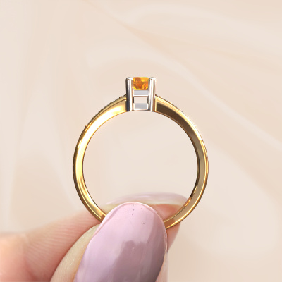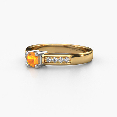 The ring shown above is called the Eline 2. We call this type of ring a pavé solitaire ring because it has one center gemstone and a band that is also pave set with gemstones. The 14 Carat gold engagement ring is set with a round 3.7 mm citrin center stone and the band is pave set with diamond gemstones. Each jewel is unique in every way! Simply customize to your liking,This modern gold pavé solitaire engagement ring has an exquisite round citrin center stone. To further accentuate the center stone, the band is fully set with more diamonds. Its open prong setting allows light to strike the citrin from various angles and this adds sparkle to your citrin ring. The photo shown above depicts the goldsmith's carefully handcrafted details of the ring. The high positioning of the center stone is truly eye-catching. The perfect engagement ring for the crown jewel of your life! Because we design and deliver our own rings, we can offer you a engagement ring at a price you won't find anywhere else. A ring is made to order, which helps prevent excess supplies, so we can make you a great price offer. We understand it feels risky, buying your engagement ring online, but we will gladly assist in the designing process, taking your budget into consideration.Our team adds new designs to our online collection daily. Our designers and goldsmiths work together in creating the best design. We strive to offer a diverse collection of jewels. Perhaps you have a specific jewel design in mind. One you came across somewhere. Please contact us for a free consultation. We will make you an offer, based on a fair price/ quality ratio, that will baffle you.To make it easier for you, we offer a 30 day return policy. Check our terms and conditions.