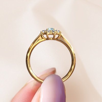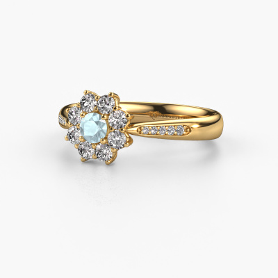 The ring shown above is called the Carolyn 2. We call this type of ring a cluster ring. The center gemstone is surrounded by smaller sized stones. This 14 Carat gold version is set with a 3.4 mm round aquamarine center stone, embraced by smaller diamonds. What makes this traditional gold cluster ring special is the setting of the smaller gems surrounding the center aquamarine, which are shaped like a beautiful flower. The surrounding cluster of stones frame the middle center stone in such a way to make it appear bigger. This type of engagement ring is also called a flower ring. It is very important that the smaller diamonds are positioned identically so there is no interference of light but perfect unity instead. Our skilled Goldsmiths get the job done. Each individual stone is carefully set by hand. During manufacturing, light fall is constantly monitored to make sure the special cluster effect is still visible. In the end you get the perfect engagement ring with a radiant aquamarine gemstone centerpiece. You can imagine the effect of a ring of such significance when you give tot the love of your life on her special day to shine. This jewel is unique in every way! Simply customize to your liking,Are you on a budget? Please feel free to contact us, so we can go discuss your options. We offer our engagement rings at guaranteed best price, because we make them to order. You won't find such a price anywhere else!Our team adds new designs to our online collection daily. Our designers and goldsmiths work together in creating the best design. We strive to offer a diverse collection of jewels. Perhaps you have a specific jewel design in mind. One you came across somewhere. Please contact us for a free consultation. We will make you an offer, based on a fair price/ quality ratio, that will baffle you.To make it easier for you, we offer a 30 day return policy. Check our terms and conditions.