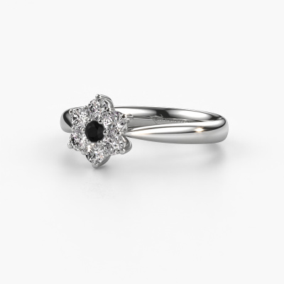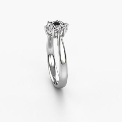 The ring shown above is called the Chantal 1. We call this type of ring a cluster ring. The center gemstone is surrounded by smaller sized stones. This platinum version is set with a 0.066 crt round black diamond center stone, embraced by smaller diamonds. What makes this traditional platinum cluster ring special is the setting of the smaller gems surrounding the center black diamond, which are shaped like a beautiful flower. The surrounding cluster of stones frame the middle center stone in such a way to make it appear bigger. This type of promise ring is also called a flower ring. It is very important that the smaller diamonds are positioned identically so there is no interference of light but perfect unity instead. Our skilled Goldsmiths get the job done. Each individual stone is carefully set by hand. During manufacturing, light fall is constantly monitored to make sure the special cluster effect is still visible. In the end you get the perfect promise ring with a radiant black diamond gemstone centerpiece. You can imagine the effect of a ring of such significance when you give tot the love of your life on her special day to shine. This jewel is unique in every way! Simply customize to your liking,By using our modern techniques, we can design and customize the finest quality jewels with the utmost care for you. Our promise ring are always priced 30 percent lower than other jewelers. We make promise ring to order so we don't have to maintain a large stock. If you have a certain budget, we are more than happy to advice you accordingly.Our designers and goldsmiths work together each day, creating new jewels. Perhaps you have found a nice traditional promise ring somewhere, which can be used to customize your unique ring. Please feel free to contact us. We will make you an offer, based on a fair price/ quality ratio, which will amaze you.To make it easier for you, we offer a 30 day return policy. Check our terms and conditions.
