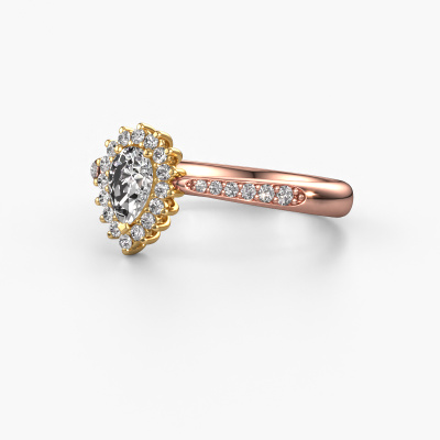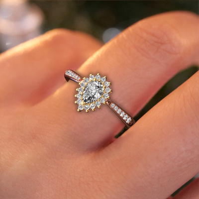 The ring shown above is called the Tilly per 2. We call this type of ring a cluster ring. The center gemstone is surrounded by smaller sized stones. This 14 Carat rose gold version is set with a 0.45 crt pear lab-grown diamond center stone, embraced by smaller diamonds. What makes this exclusive rose gold cluster ring special is the setting of the smaller gems surrounding the center lab-grown diamond, which are shaped like a beautiful flower. The surrounding cluster of stones frame the middle center stone in such a way to make it appear bigger. This type of engagement ring is also called a flower ring. It is very important that the smaller diamonds are positioned identically so there is no interference of light but perfect unity instead. Our skilled Goldsmiths get the job done. Each individual stone is carefully set by hand. During manufacturing, light fall is constantly monitored to make sure the special cluster effect is still visible. In the end you get the perfect engagement ring with a radiant lab-grown diamond gemstone centerpiece. You can imagine the effect of a ring of such significance when you give tot the love of your life on her special day to shine. This jewel is made just for you, with attention to detail and design.After receiving your order, our goldsmiths will passionately start the creative process of making your engagement ring in our own studio. Because we don't have a big stockpile, these costs will not be passed on to you. Our pricing is proof of that! We offer top quality jewels at lowest price, guaranteed.Different styles of new rings are made daily by our team. Perhaps you have found a cluster engagement ring somewhere. One you would like to give to your loved one. Please feel free to share your thoughts and design with our jewel designers. We would love to turn your design into a exclusive engagement ring. You can follow the development of your ring design because we use very detailed 3D drawings. On top of that, you can order a dummy of the design. A dummy is a plastic ring, which can be shaped according your ring design. You can try it on and check if the engagement ring is up to standard. We will gladly send you a non-binding offer, based on a fair price/ quality ratio. The offer will baffle you, considering the quality of the ring and gemstones.To make it easier for you, we offer a 30 day return policy. Check our terms and conditions.