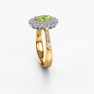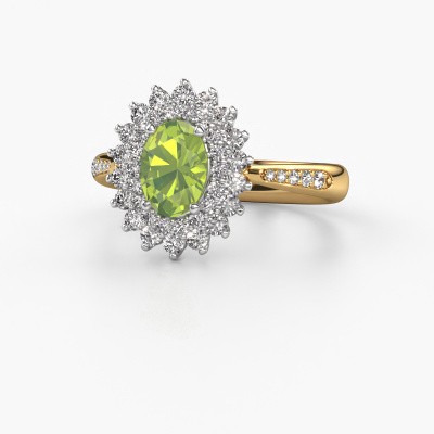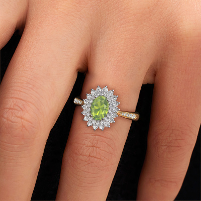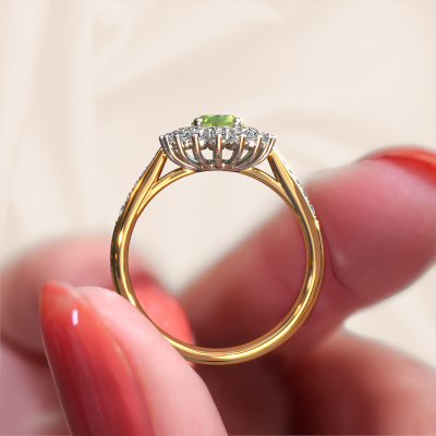 The ring shown above is called the Alina 2. We call this type of ring a cluster ring. The center gemstone is surrounded by smaller sized stones. This 14 Carat gold version is set with a 7x5 mm oval peridot center stone, embraced by smaller diamonds. What makes this exclusive gold cluster ring special is the setting of the smaller gems surrounding the center peridot, which are shaped like a beautiful flower. The surrounding cluster of stones frame the middle center stone in such a way to make it appear bigger. This type of engagement ring is also called a flower ring. It is very important that the smaller diamonds are positioned identically so there is no interference of light but perfect unity instead. Our skilled Goldsmiths get the job done. Each individual stone is carefully set by hand. During manufacturing, light fall is constantly monitored to make sure the special cluster effect is still visible. In the end you get the perfect engagement ring with a radiant peridot gemstone centerpiece. You can imagine the effect of a ring of such significance when you give tot the love of your life on her special day to shine. This jewel is made just for you, with attention to detail and design.By using a combination of the latest modern techniques, combined with ancient crafting, we can make all our engagement rings in our own studio. Each jewel is made to order. This is advantageous because we can offer you a price you won't find anywhere else.Have you found a specific engagement ring somewhere which you would like to give to your loved one? Please feel free to express your wishes to our jewel designers because we would be honored to turn your design into a exclusive engagement ring. You can follow the development of your ring design because we use 3D drawings. This gives you a realistic preview of how your design will look. You can also preorder a dummy. A dummy is a plastic ring, which can be shaped according your ring design. You can try it on and check if its width and size are suitable for you. We will gladly send you a non-binding offer, based on a fair price/ quality ratio. It will amaze you, considering the quality of the ring and gemstones.To make it easier for you, we offer a 30 day return policy. Check our terms and conditions.