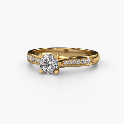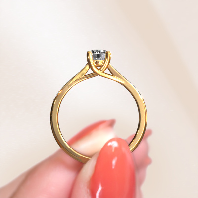 The ring shown above is called the Mia 2. We call this type of ring a pavé solitaire ring because it has one center gemstone and a band that is also pave set with gemstones. This engagement ring is made in 14 Carat gold set with a 0.40 crt round diamond, and pave set lab grown diamonds at the sides. Each piece of jewelry is made just for you, with attention to detail and design.This modern gold pavé solitaire engagement ring has an exquisite round diamond center stone. To further accentuate the center stone, the band is set full with more lab grown diamonds. Its open prong setting allows light to strike the diamond from various angles and this adds sparkle to your diamond ring. The photo shown above depicts the goldsmith's carefully handcrafted details of the ring. The high positioning of the center stone is truly eye-catching. The perfect engagement ring for the crown jewel of your life!By using our modern techniques, we can design and customize the finest quality jewels with the utmost care for you. Our engagement rings are always priced 30 percent lower than other jewelers. We make engagement rings to order so we don't have to maintain a large stock. If you have a certain budget, we are more than happy to advice you accordingly.Different styles of new rings are made daily by our team. Perhaps you have found a pavé solitaire engagement ring somewhere. One you would like to give to your loved one. Please feel free to share your thoughts and design with our jewel designers. We would love to turn your design into a modern engagement ring. You can follow the development of your ring design because we use very detailed 3D drawings. On top of that, you can order a dummy of the design. A dummy is a plastic ring, which can be shaped according your ring design. You can try it on and check if the engagement ring is up to standard. We will gladly send you a non-binding offer, based on a fair price/ quality ratio. The offer will baffle you, considering the quality of the ring and gemstones.To make it easier for you, we offer a 30 day return policy. Check our terms and conditions.