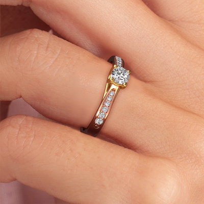 The ring shown above is called the Mia 2. We call this type of ring a pavé solitaire ring because it has one center gemstone and a band that is also pave set with gemstones. This engagement ring is made in 14 Carat rose gold set with a 0.30 crt round diamond, and pave set lab grown diamonds at the sides. Each piece of jewelry is made just for you, with attention to detail and design.This modern rose gold pavé solitaire engagement ring has an exquisite round diamond center stone. To further accentuate the center stone, the band is set full with more lab grown diamonds. Its open prong setting allows light to strike the diamond from various angles and this adds sparkle to your diamond ring. The photo shown above depicts the goldsmith's carefully handcrafted details of the ring. The high positioning of the center stone is truly eye-catching. The perfect engagement ring for the crown jewel of your life!By using our modern techniques, we can design and customize the finest quality jewels with the utmost care for you. Our engagement rings are always priced 30 percent lower than other jewelers. We make engagement rings to order so we don't have to maintain a large stock. If you have a certain budget, we are more than happy to advice you accordingly.Different styles of new rings are made daily by our team. Perhaps you have found a pavé solitaire engagement ring somewhere. One you would like to give to your loved one. Please feel free to share your thoughts and design with our jewel designers. We would love to turn your design into a modern engagement ring. You can follow the development of your ring design because we use very detailed 3D drawings. On top of that, you can order a dummy of the design. A dummy is a plastic ring, which can be shaped according your ring design. You can try it on and check if the engagement ring is up to standard. We will gladly send you a non-binding offer, based on a fair price/ quality ratio. The offer will baffle you, considering the quality of the ring and gemstones.To make it easier for you, we offer a 30 day return policy. Check our terms and conditions.