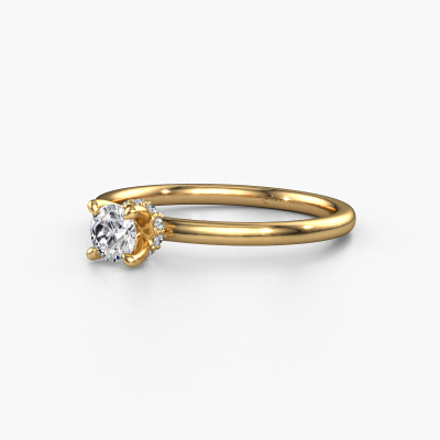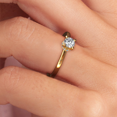 The ring shown above is called the Crystal RND 3, we call this a solitaire ring because it contains a single gemstone. The engagement ring is made in 14 Carat gold and has a round diamond of 0.25 crt. The cool thing about our configurator is that you can compile your own piece of jewelry, into a completely personalized one. This solitaire ring is crafted in the precious metals gold with gold, but of course you are free to pick your own colors. Each piece of jewelry is made with passion and love by one of our master goldsmiths.The solitaire ring is a special type of engagement ring. Its open prong setting allows light to strike the gemstone from various angles. This classic engagement ring is a stunning eye-catcher because of the high positioning of the gemstone. In order for you to commemorate your proposal with a unique ring, we carefully adorn this solitaire ring by hand. The love of your life deserves nothing but the best. By using a combination of the latest modern techniques, combined with ancient crafting, we can make all our engagement rings in our own studio. Each jewel is made to order. This is advantageous because we can offer you a price you won't find anywhere else.Different styles of new rings are made daily by our team. Perhaps you have found a solitaire engagement ring somewhere. One you would like to give to your loved one. Please feel free to share your thoughts and design with our jewel designers. We would love to turn your design into a classic engagement ring. You can follow the development of your ring design because we use very detailed 3D drawings. On top of that, you can order a dummy of the design. A dummy is a plastic ring, which can be shaped according your ring design. You can try it on and check if the engagement ring is up to standard. We will gladly send you a non-binding offer, based on a fair price/ quality ratio. The offer will baffle you, considering the quality of the ring and gemstones.To make it easier for you, we offer a 30 day return policy. Check our terms and conditions.