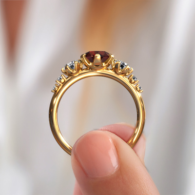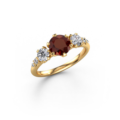 This 14 Carat gold ring is called Aniek RND and is set with garnet. How would you describe the style of the love of your life? Does she have a unique sense of style? This stunning graceful gold engagement ring can be custom made to your own or her liking. Our garnet gemstones have been carefully selected because we believe your fantasy engagement ring must be adorned with nothing but the most beautiful gemstone. Don't you agree? This jewel is made just for you by our master goldsmiths in our own studio.Are you on a budget? Please feel free to contact us, so we can go discuss your options. We offer our engagement rings at guaranteed best price, because we make them to order. You won't find such a price anywhere else!Have you found a specific engagement ring somewhere which you would like to give to your loved one? Please feel free to express your wishes to our jewel designers because we would be honored to turn your design into a fantasy engagement ring. You can follow the development of your ring design because we use 3D drawings. This gives you a realistic preview of how your design will look. You can also preorder a dummy. A dummy is a plastic ring, which can be shaped according your ring design. You can try it on and check if its width and size are suitable for you. We will gladly send you a non-binding offer, based on a fair price/ quality ratio. It will amaze you, considering the quality of the ring and gemstones.To make it easier for you, we offer a 30 day return policy. Check our terms and conditions.