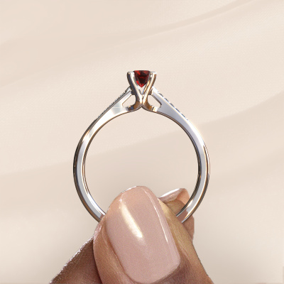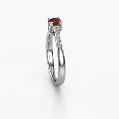 The ring shown above is called the Janna 2. We call this type of ring a pavé solitaire ring because it has one center gemstone and a band that is also pave set with gemstones. This promise ring is made in 14 Carat white gold set with a 4 mm round garnet, and pave set diamonds at the sides. Each piece of jewelry is made just for you by our master goldsmiths in our own studio.This classic white gold pavé solitaire promise ring has an exquisite round garnet center stone. To further accentuate the center stone, the band is set full with more diamonds. Its open prong setting allows light to strike the garnet from various angles and this adds sparkle to your garnet ring. The photo shown above depicts the goldsmith's carefully handcrafted details of the ring. The high positioning of the center stone is truly eye-catching. The perfect promise ring for the crown jewel of your life!By using a combination of the latest modern techniques, combined with ancient crafting, we can make all our promise ring in our own studio. Each jewel is made to order. This is advantageous because we can offer you a price you won't find anywhere else.Do you have a specific ring in mind? One you came across somewhere. Please feel free to tell us your wishes and we will turn your design into a unique promise ring. You can follow the development of your ring design because we use 3D drawings. This gives you a realistic preview of your design. We will gladly send you a non-binding offer, based on a fair price/ quality ratio. It will amaze you.To make it easier for you, we offer a 30 day return policy. Check our terms and conditions.