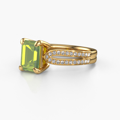 This 14 Carat gold ring is called Antonia eme 2 and is set with 8x6 mm peridot. Does your girlfriend fancy exclusive jewelry? Or would you like to show her that she deserves the finest jewelry? This gold ring is pure craftsmanship, love and passion combined with the latest techniques coming together in perfect harmony. It requires a keen eye, patience and a skillful hand to mold this ring into perfection. Just the job for our expert goldsmith! The peridot set gemstones gives this gold ring an extra glamorous appearance. Customize the style of the split band engagement ring to her liking with a wide variety of precious metals and gemstones which you select. That is how you create a unique ring for the most exclusive woman in your life! This jewel is made to shine bright around your finger. Each jewel is hand made with love by our goldsmiths.After receiving your order, our goldsmiths will start the creative process of making your Antonia eme 2 engagement ring. We don't keep stock. This is advantageous because these costs will not be passed on to you. Therefore, we can offer jewelry at exceptionally low prices.Do you have a specific ring in mind? One you came across somewhere. Please feel free to tell us your wishes and we will turn your design into a unique engagement ring. You can follow the development of your ring design because we use 3D drawings. This gives you a realistic preview of your design. We will gladly send you a non-binding offer, based on a fair price/ quality ratio. It will amaze you.To make it easier for you, we offer a 30 day return policy. Check our terms and conditions.