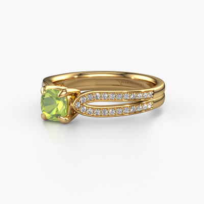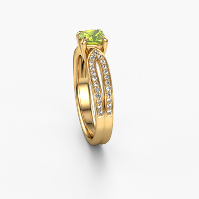 The ring shown above is called the Antonia cus 2. We call this type of ring a pavé solitaire ring because it has one center gemstone and a band that is also pave set with gemstones. The 14 Carat gold engagement ring is set with a cushion 5 mm peridot center stone and the band is pave set with lab-grown diamond gemstones. Each jewel is made just for you by our master goldsmiths in our own studio.This fantasy gold pavé solitaire engagement ring has an exquisite cushion peridot center stone. To further accentuate the center stone, the band is fully set with more lab grown diamonds. Its open prong setting allows light to strike the peridot from various angles and this adds sparkle to your peridot ring. The photo shown above depicts the goldsmith's carefully handcrafted details of the ring. The high positioning of the center stone is truly eye-catching. The perfect engagement ring for the crown jewel of your life! By using our modern techniques, we can design and customize the finest quality jewels with the utmost care for you. Our engagement rings are always priced 30 percent lower than other jewelers. We make engagement rings to order so we don't have to maintain a large stock. If you have a certain budget, we are more than happy to advice you accordingly.Have you found a specific engagement ring somewhere which you would like to give to your loved one? Please feel free to express your wishes to our jewel designers because we would be honored to turn your design into a fantasy engagement ring. You can follow the development of your ring design because we use 3D drawings. This gives you a realistic preview of how your design will look. You can also preorder a dummy. A dummy is a plastic ring, which can be shaped according your ring design. You can try it on and check if its width and size are suitable for you. We will gladly send you a non-binding offer, based on a fair price/ quality ratio. It will amaze you, considering the quality of the ring and gemstones.To make it easier for you, we offer a 30 day return policy. Check our terms and conditions.