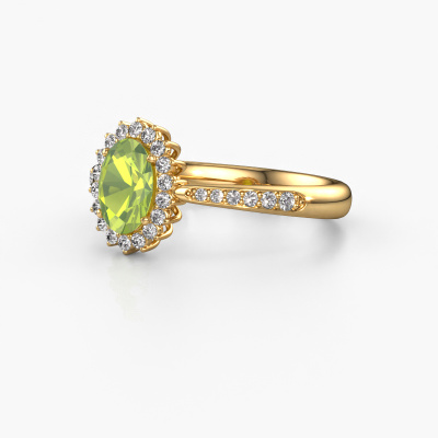 The ring shown above is called the Tilly ovl 2. We call this type of ring a cluster ring, the center gemstone is surrounded by smaller sized stones. This 14 Carat gold version is set with a 7x5 mm oval peridot center stone, embraced by smaller lab grown diamonds. If you look at this gold cluster engagement ring, you might get the impression that its smaller sized stones collide with the bigger peridot, so it is shaped like a flower. Therefore this engagement ring is also known as the flower ring. Our artisan goldsmiths get the job done. Each individual stone is carefully set by hand. During manufacturing, light fall is constantly monitored to make sure the special cluster effect is still visible. In the end you get the perfect engagement ring with a radiant peridot gemstone centerpiece. You can imagine the effect of a ring of such significance when you give tot the love of your life on her special day to shine. By using our modern techniques, we can design and customize the finest quality jewels with the utmost care for you. Our engagement rings are always priced 30 percent lower than other jewelers. We make engagement rings to order so we don't have to maintain a large stock. If you have a certain budget, we are more than happy to advice you accordingly.Different styles of new rings are made daily by our team. Perhaps you have found a cluster engagement ring somewhere. One you would like to give to your loved one. Please feel free to share your thoughts and design with our jewel designers. We would love to turn your design into a classic engagement ring. You can follow the development of your ring design because we use very detailed 3D drawings. On top of that, you can order a dummy of the design. A dummy is a plastic ring, which can be shaped according your ring design. You can try it on and check if the engagement ring is up to standard. We will gladly send you a non-binding offer, based on a fair price/ quality ratio. The offer will baffle you, considering the quality of the ring and gemstones.To make it easier for you, we offer a 30 day return policy. Check our terms and conditions.