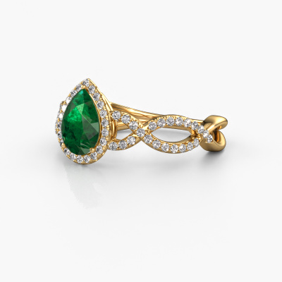This 14 Carat gold ring is called Dionne pear and is set with 7x5 mm emerald. Does your girlfriend fancy exclusive jewelry? Or would you like to show her that she deserves the finest jewelry? This gold ring is pure craftsmanship, love and passion combined with the latest techniques coming together in perfect harmony. It requires a keen eye, patience and a skillful hand to mold this ring into perfection. Just the job for our expert goldsmith! The emeralds set gemstones gives this gold ring an extra glamorous appearance. Customize the style of the twist engagement ring to her liking with a wide variety of precious metals and gemstones which you select. That is how you create a unique ring for the most exclusive woman in your life! This jewel is created to add sparkle to your finger, each jewel is lovingly made by hand by our goldsmiths.Are you on a budget? Please feel free to contact us, so we can go discuss your options. We offer our engagement rings at guaranteed best price, because we make them to order. You won't find such a price anywhere else!Different styles of new rings are made daily by our team. Perhaps you have found a pavé solitaire engagement ring somewhere. One you would like to give to your loved one. Please feel free to share your thoughts and design with our jewel designers. We would love to turn your design into a exclusive engagement ring. You can follow the development of your ring design because we use very detailed 3D drawings. On top of that, you can order a dummy of the design. A dummy is a plastic ring, which can be shaped according your ring design. You can try it on and check if the engagement ring is up to standard. We will gladly send you a non-binding offer, based on a fair price/ quality ratio. The offer will baffle you, considering the quality of the ring and gemstones.To make it easier for you, we offer a 30 day return policy. Check our terms and conditions.