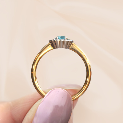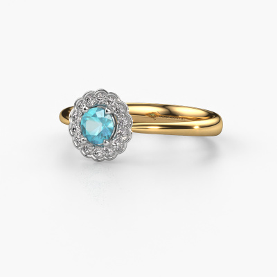 The ring shown above is called the Debi. We call this type of ring a halo ring because it has one center gemstone and a band that is also pave set with gemstones. The 14 Carat gold engagement ring is set with a round 4.2 mm blue topaz center stone and the band is pave set with diamonds. What makes this classic gold halo ring special are the smaller sized stones embracing the center stone. This gorgeous engagement ring is called a halo ring because the smaller gemstones give the center stone a halo of surrounding light. In order for the smaller stones to enhance the center stone, they have to be placed so there is no interference of light. And that's when our expert goldsmiths come in. Each individual stone is carefully set in the ring by hand. During manufacturing, light fall is constantly monitored to make sure the special halo is still visible. In the end you get a unique engagement ring, with a blue topaz of your choosing at its centre. You can imagine the effect of a ring of such significance when you give it to her on her special day to shine. Because we design and deliver our own rings, we can offer you a engagement ring at a price you won't find anywhere else. A ring is made to order, which helps prevent excess supplies, so we can make you a great price offer. We understand it feels risky, buying your engagement ring online, but we will gladly assist in the designing process, taking your budget into consideration.Our team adds new designs to our online collection daily. Our designers and goldsmiths work together in creating the best design. We strive to offer a diverse collection of jewels. Perhaps you have a specific jewel design in mind. One you came across somewhere. Please contact us for a free consultation. We will make you an offer, based on a fair price/ quality ratio, that will baffle you.To make it easier for you, we offer a 30 day return policy. Check our terms and conditions.