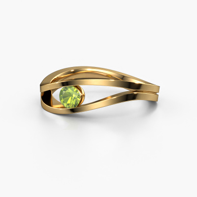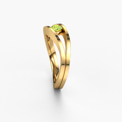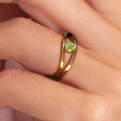 This 14 Carat gold ring is called Sigrid 1 and is set with 3.7 mm peridot. This design gold engagement ring is a true masterpiece! Our expert goldsmith uses special techniques during crafting of this tension set ring to make sure the peridot of this gold ring is fixed properly. The effect is that light fall reflects beautifully on the gemstone, which gives the ring its maximum shine and glamorous appearance. The result is a unique ring, with a trendy appearance, passionately handcrafted to perfection by our artisan goldsmith. A one-of-a-kind ring, designed for the love of your life! This jewel is made to shine bright around your finger. Each jewel is hand made with love by our goldsmiths.By using our modern techniques, we can design and customize the finest quality jewels with the utmost care for you. Our engagement rings are always priced 30 percent lower than other jewelers. We make engagement rings to order so we don't have to maintain a large stock. If you have a certain budget, we are more than happy to advice you accordingly.Different styles of new rings are made daily by our team. Perhaps you have found a solitaire engagement ring somewhere. One you would like to give to your loved one. Please feel free to share your thoughts and design with our jewel designers. We would love to turn your design into a design engagement ring. You can follow the development of your ring design because we use very detailed 3D drawings. On top of that, you can order a dummy of the design. A dummy is a plastic ring, which can be shaped according your ring design. You can try it on and check if the engagement ring is up to standard. We will gladly send you a non-binding offer, based on a fair price/ quality ratio. The offer will baffle you, considering the quality of the ring and gemstones.To make it easier for you, we offer a 30 day return policy. Check our terms and conditions.