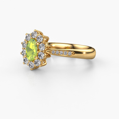 The ring shown above is called the Leesa 2. We call this type of ring a cluster ring, the center gemstone is surrounded by smaller sized stones. This 14 Carat gold version is set with a 6x4 mm oval peridot center stone, embraced by smaller diamonds. The classic gold cluster engagement ring stands out because of its shape. Together, the smaller and bigger sized peridot gemstones form a flower and they appear to collide into one big sparkling gem. This classic engagement ring is also known as the flower ring. Our expert Goldsmiths make sure the smaller diamonds stones are set identically so there is no light interference in the peridot but unity instead. With perfect precision and a skillful hand each peridot is set in the ring. During manufacturing, it is constantly monitored to make sure light reflects flawlessly. This results in a unique engagement ring, with a radiant peridot at its centre. A lovely, meaningful gift to bestow upon the love of your life. Are you on a budget? Please feel free to contact us, so we can go discuss your options. We offer our engagement rings at guaranteed best price, because we make them to order. You won't find such a price anywhere else!Our designers and goldsmiths work together each day, creating new jewels. Perhaps you have found a nice classic engagement ring somewhere, which can be used to customize your unique ring. Please feel free to contact us. We will make you an offer, based on a fair price/ quality ratio, which will amaze you.To make it easier for you, we offer a 30 day return policy. Check our terms and conditions.