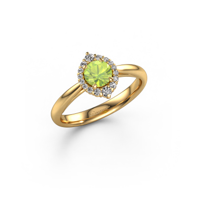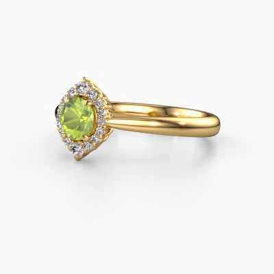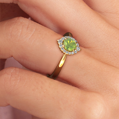 The ring shown above is called the Tora. We call this type of ring a cluster ring, the center gemstone is surrounded by smaller sized stones. This 14 Carat gold version is set with a 5 mm round peridot center stone, embraced by smaller lab grown diamonds. The classic gold cluster engagement ring stands out because of its shape. Together, the smaller and bigger sized peridot gemstones form a flower and they appear to collide into one big sparkling gem. This classic engagement ring is also known as the flower ring. Our expert Goldsmiths make sure the smaller lab grown diamonds stones are set identically so there is no light interference in the peridot but unity instead. With perfect precision and a skillful hand each peridot is set in the ring. During manufacturing, it is constantly monitored to make sure light reflects flawlessly. This results in a unique engagement ring, with a radiant peridot at its centre. A lovely, meaningful gift to bestow upon the love of your life. By using a combination of the latest modern techniques, combined with ancient crafting, we can make all our engagement rings in our own studio. Each jewel is made to order. This is advantageous because we can offer you a price you won't find anywhere else.Have you found a specific engagement ring somewhere which you would like to give to your loved one? Please feel free to express your wishes to our jewel designers because we would be honored to turn your design into a classic engagement ring. You can follow the development of your ring design because we use 3D drawings. This gives you a realistic preview of how your design will look. You can also preorder a dummy. A dummy is a plastic ring, which can be shaped according your ring design. You can try it on and check if its width and size are suitable for you. We will gladly send you a non-binding offer, based on a fair price/ quality ratio. It will amaze you, considering the quality of the ring and gemstones.To make it easier for you, we offer a 30 day return policy. Check our terms and conditions.
