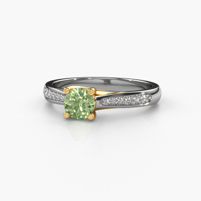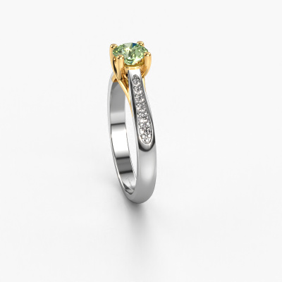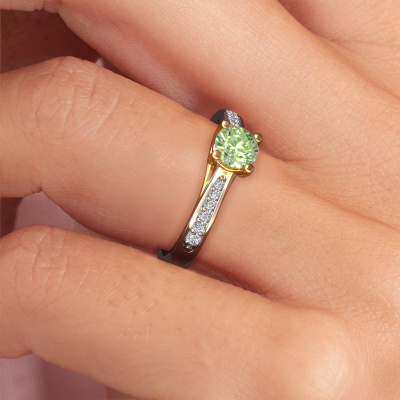 The ring shown above is called the Mia 2. We call this type of ring a pavé solitaire ring because it has one center gemstone and a band that is also pave set with gemstones. This engagement ring is made in 14 Carat white gold set with a 5 mm round green lab grown diamond, and pave set lab grown diamonds at the sides. Each piece of jewelry is made just for you, with attention to detail and design.This modern white gold pavé solitaire engagement ring has an exquisite round green lab grown diamond center stone. To further accentuate the center stone, the band is set full with more lab grown diamonds. Its open prong setting allows light to strike the green lab grown diamond from various angles and this adds sparkle to your green lab grown diamond ring. The photo shown above depicts the goldsmith's carefully handcrafted details of the ring. The high positioning of the center stone is truly eye-catching. The perfect engagement ring for the crown jewel of your life!By using our modern techniques, we can design and customize the finest quality jewels with the utmost care for you. Our engagement rings are always priced 30 percent lower than other jewelers. We make engagement rings to order so we don't have to maintain a large stock. If you have a certain budget, we are more than happy to advice you accordingly.Different styles of new rings are made daily by our team. Perhaps you have found a pavé solitaire engagement ring somewhere. One you would like to give to your loved one. Please feel free to share your thoughts and design with our jewel designers. We would love to turn your design into a modern engagement ring. You can follow the development of your ring design because we use very detailed 3D drawings. On top of that, you can order a dummy of the design. A dummy is a plastic ring, which can be shaped according your ring design. You can try it on and check if the engagement ring is up to standard. We will gladly send you a non-binding offer, based on a fair price/ quality ratio. The offer will baffle you, considering the quality of the ring and gemstones.To make it easier for you, we offer a 30 day return policy. Check our terms and conditions.