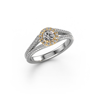 This 14 Carat white gold ring is called Verla rnd 2 and is set with 0.634 crt diamond. This exclusive white gold halo engagement ring is a true work of art! The ornaments are crafted with a lot of patience and great passion. In order to create this ring with great precision, this craft requires a keen eye and skillful hand. A challenge which ignites a fire in our expert goldsmith. The exquisite diamonds are set in a special way so they stand out even more. This gives the ring an even more glamorous appearance. The split band engagement ring is actually unique on its own because of the gemstones which we carefully select especially for this ring. On top of that you select the precious metals which will be used to create a unique ring for the most extraordinary woman in your life! This jewel is made just for you, with attention to detail and design.Because we design and deliver our own rings, we can offer you a engagement ring at a price you won't find anywhere else. A ring is made to order, which helps prevent excess supplies, so we can make you a great price offer. We understand it feels risky, buying your engagement ring online, but we will gladly assist in the designing process, taking your budget into consideration.Our team adds new designs to our online collection daily. Our designers and goldsmiths work together in creating the best design. We strive to offer a diverse collection of jewels. Perhaps you have a specific jewel design in mind. One you came across somewhere. Please contact us for a free consultation. We will make you an offer, based on a fair price/ quality ratio, that will baffle you.To make it easier for you, we offer a 30 day return policy. Check our terms and conditions.