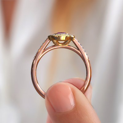 The ring shown above is called the Noud 2 OVL. We call this type of ring a halo ring because it has one center gemstone and a band that is also pave set with gemstones. The 14 Carat rose gold engagement ring is set with a oval 6x4 mm amethyst center stone and the band is pave set with lab grown diamonds. What makes this exclusive rose gold halo ring special are the smaller sized stones embracing the center stone. This gorgeous engagement ring is called a halo ring because the smaller gemstones give the center stone a halo of surrounding light. In order for the smaller stones to enhance the center stone, they have to be placed so there is no interference of light. And that's when our expert goldsmiths come in. Each individual stone is carefully set in the ring by hand. During manufacturing, light fall is constantly monitored to make sure the special halo is still visible. In the end you get a unique engagement ring, with a amethyst of your choosing at its centre. You can imagine the effect of a ring of such significance when you give it to her on her special day to shine. By using our modern techniques, we can design and customize the finest quality jewels with the utmost care for you. Our engagement rings are always priced 30 percent lower than other jewelers. We make engagement rings to order so we don't have to maintain a large stock. If you have a certain budget, we are more than happy to advice you accordingly.Have you found a specific engagement ring somewhere which you would like to give to your loved one? Please feel free to express your wishes to our jewel designers because we would be honored to turn your design into a exclusive engagement ring. You can follow the development of your ring design because we use 3D drawings. This gives you a realistic preview of how your design will look. You can also preorder a dummy. A dummy is a plastic ring, which can be shaped according your ring design. You can try it on and check if its width and size are suitable for you. We will gladly send you a non-binding offer, based on a fair price/ quality ratio. It will amaze you, considering the quality of the ring and gemstones.To make it easier for you, we offer a 30 day return policy. Check our terms and conditions.