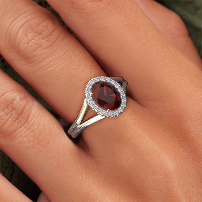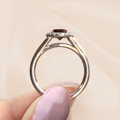 This platinum ring is called Verla ovl 1 and is set with 8x6 mm garnet. This exclusive platinum halo engagement ring is a true work of art! The ornaments are crafted with a lot of patience and great passion. In order to create this ring with great precision, this craft requires a keen eye and skillful hand. A challenge which ignites a fire in our expert goldsmith. The exquisite garnet are set in a special way so they stand out even more. This gives the ring an even more glamorous appearance. The split band engagement ring is actually unique on its own because of the gemstones which we carefully select especially for this ring. On top of that you select the precious metals which will be used to create a unique ring for the most extraordinary woman in your life! This jewel is made to shine bright around your finger. Each jewel is hand made with love by our goldsmiths.By using a combination of the latest modern techniques, combined with ancient crafting, we can make all our engagement rings in our own studio. Each jewel is made to order. This is advantageous because we can offer you a price you won't find anywhere else.Do you have a specific ring in mind? One you came across somewhere. Please feel free to tell us your wishes and we will turn your design into a unique engagement ring. You can follow the development of your ring design because we use 3D drawings. This gives you a realistic preview of your design. We will gladly send you a non-binding offer, based on a fair price/ quality ratio. It will amaze you.To make it easier for you, we offer a 30 day return policy. Check our terms and conditions.