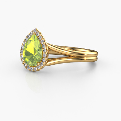 This 14 Carat gold ring is called Verla pear 1 and is set with 8x6 mm peridot. This exclusive gold halo engagement ring is a true work of art! The ornaments are crafted with a lot of patience and great passion. In order to create this ring with great precision, this craft requires a keen eye and skillful hand. A challenge which ignites a fire in our expert goldsmith. The exquisite peridot are set in a special way so they stand out even more. This gives the ring an even more glamorous appearance. The graceful engagement ring is actually unique on its own because of the gemstones which we carefully select especially for this ring. On top of that you select the precious metals which will be used to create a unique ring for the most extraordinary woman in your life! This jewel is made to shine bright around your finger. Each jewel is hand made with love by our goldsmiths.By using a combination of the latest modern techniques, combined with ancient crafting, we can make all our engagement rings in our own studio. Each jewel is made to order. This is advantageous because we can offer you a price you won't find anywhere else.Have you found a specific engagement ring somewhere which you would like to give to your loved one? Please feel free to express your wishes to our jewel designers because we would be honored to turn your design into a luxury engagement ring. You can follow the development of your ring design because we use 3D drawings. This gives you a realistic preview of how your design will look. You can also preorder a dummy. A dummy is a plastic ring, which can be shaped according your ring design. You can try it on and check if its width and size are suitable for you. We will gladly send you a non-binding offer, based on a fair price/ quality ratio. It will amaze you, considering the quality of the ring and gemstones.To make it easier for you, we offer a 30 day return policy. Check our terms and conditions.