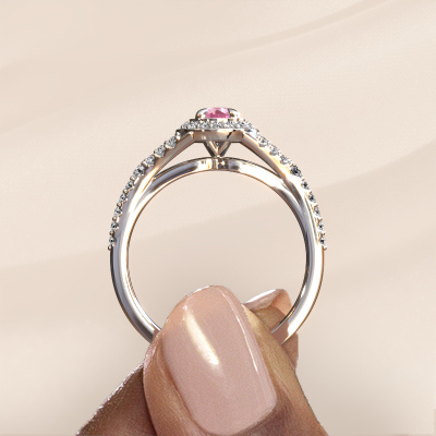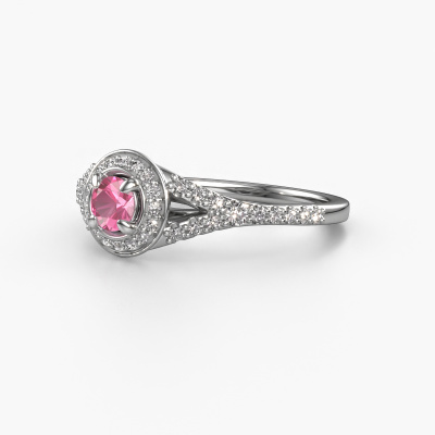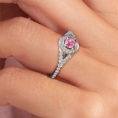 This platinum ring is called Pamela RND and is set with 4 mm pink sapphire. This exclusive platinum halo engagement ring is a true work of art! The ornaments are crafted with a lot of patience and great passion. In order to create this ring with great precision, this craft requires a keen eye and skillful hand. A challenge which ignites a fire in our expert goldsmith. The exquisite pink sapphire are set in a special way so they stand out even more. This gives the ring an even more glamorous appearance. The ajour engagement ring is actually unique on its own because of the gemstones which we carefully select especially for this ring. On top of that you select the precious metals which will be used to create a unique ring for the most extraordinary woman in your life! This jewel is unique in every way! Simply customize to your liking,Because we design and deliver our own rings, we can offer you a engagement ring at a price you won't find anywhere else. A ring is made to order, which helps prevent excess supplies, so we can make you a great price offer. We understand it feels risky, buying your engagement ring online, but we will gladly assist in the designing process, taking your budget into consideration.Our team adds new designs to our online collection daily. Our designers and goldsmiths work together in creating the best design. We strive to offer a diverse collection of jewels. Perhaps you have a specific jewel design in mind. One you came across somewhere. Please contact us for a free consultation. We will make you an offer, based on a fair price/ quality ratio, that will baffle you.To make it easier for you, we offer a 30 day return policy. Check our terms and conditions.