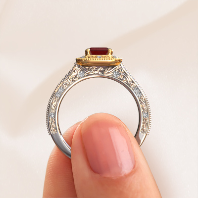 This 14 Carat white gold ring is called Alice EME and is set with 7x5 mm ruby. An extraordinary white gold vintage ring. One that will surely make the love of your life shine like a diamond! That is what we hope to achieve. This vintage Engagement ring is set with exquisite ruby. Whichever gemstone you choose from our selection, is up to you. The gemstone is selected with great care because we believe your pearl edges Engagement ring must be adorned with nothing but the most beautiful gemstone. Wouldn't you agree? Our expert goldsmith will design your ring in our own crafting studio, where the ruby will be set with great precision. The ring will then be polished till it shines perfectly. Nothing but the best for the love of your life! This jewel is made just for you by our master goldsmiths in our own studio.By using a combination of the latest modern techniques, combined with ancient crafting, we can make all our Engagement rings in our own studio. Each jewel is made to order. This is advantageous because we can offer you a price you won't find anywhere else.Do you have a specific ring in mind? One you came across somewhere. Please feel free to tell us your wishes and we will turn your design into a unique Engagement ring. You can follow the development of your ring design because we use 3D drawings. This gives you a realistic preview of your design. We will gladly send you a non-binding offer, based on a fair price/ quality ratio. It will amaze you.To make it easier for you, we offer a 30 day return policy. Check our terms and conditions.