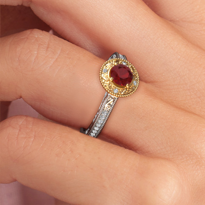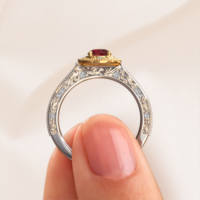 This 14 Carat white gold ring is called Alice RND and is set with 5 mm ruby. An extraordinary white gold vintage ring. One that will surely make the love of your life shine like a diamond! That is what we hope to achieve. This vintage Engagement ring is set with exquisite ruby. Whichever gemstone you choose from our selection, is up to you. The gemstone is selected with great care because we believe your pearl edges Engagement ring must be adorned with nothing but the most beautiful gemstone. Wouldn't you agree? Our expert goldsmith will design your ring in our own crafting studio, where the ruby will be set with great precision. The ring will then be polished till it shines perfectly. Nothing but the best for the love of your life! This jewel is made to shine bright around your finger. Each jewel is hand made with love by our goldsmiths.Are you on a budget? Please feel free to contact us, so we can go discuss your options. We offer our Engagement rings at guaranteed best price, because we make them to order. You won't find such a price anywhere else!Our team adds new designs to our online collection daily. Our designers and goldsmiths work together in creating the best design. We strive to offer a diverse collection of jewels. Perhaps you have a specific jewel design in mind. One you came across somewhere. Please contact us for a free consultation. We will make you an offer, based on a fair price/ quality ratio, that will baffle you.To make it easier for you, we offer a 30 day return policy. Check our terms and conditions.