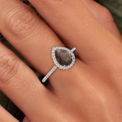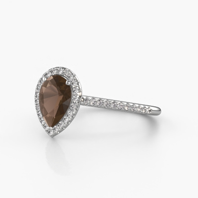 The ring shown above is called the Seline per 2. We call this type of ring a halo ring because it has one center gemstone and a band that is also pave set with gemstones. The platinum engagement ring is set with a pear 8x6 mm smokey quartz center stone and the band is pave set with diamonds. What makes this classic platinum halo ring special are the smaller sized stones embracing the center stone. This gorgeous engagement ring is called a halo ring because the smaller gemstones give the center stone a halo of surrounding light. In order for the smaller stones to enhance the center stone, they have to be placed so there is no interference of light. And that's when our expert goldsmiths come in. Each individual stone is carefully set in the ring by hand. During manufacturing, light fall is constantly monitored to make sure the special halo is still visible. In the end you get a unique engagement ring, with a smokey quartz of your choosing at its centre. You can imagine the effect of a ring of such significance when you give it to her on her special day to shine. Because we design and deliver our own rings, we can offer you a engagement ring at a price you won't find anywhere else. A ring is made to order, which helps prevent excess supplies, so we can make you a great price offer. We understand it feels risky, buying your engagement ring online, but we will gladly assist in the designing process, taking your budget into consideration.Our designers and goldsmiths work together each day, creating new jewels. Perhaps you have found a nice classic engagement ring somewhere, which can be used to customize your unique ring. Please feel free to contact us. We will make you an offer, based on a fair price/ quality ratio, which will amaze you.To make it easier for you, we offer a 30 day return policy. Check our terms and conditions.