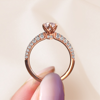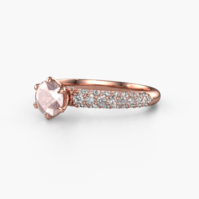 The ring shown above is called the Meryl. We call this type of ring a pavé solitaire ring because it has one center gemstone and a band that is also pave set with gemstones. This engagement ring is made in 14 Carat rose gold set with a 5.7 mm round morganite champagne, and pave set diamonds at the sides. Each piece of jewelry is made just for you, with attention to detail and design.This exclusive rose gold pavé solitaire engagement ring has an exquisite round morganite champagne center stone. To further accentuate the center stone, the band is set full with more diamonds. Its open prong setting allows light to strike the morganite champagne from various angles and this adds sparkle to your morganite champagne ring. The photo shown above depicts the goldsmith's carefully handcrafted details of the ring. The high positioning of the center stone is truly eye-catching. The perfect engagement ring for the crown jewel of your life!After receiving your order, our goldsmiths will passionately start the creative process of making your engagement ring in our own studio. Because we don't have a big stockpile, these costs will not be passed on to you. Our pricing is proof of that! We offer top quality jewels at lowest price, guaranteed.Have you found a specific engagement ring somewhere which you would like to give to your loved one? Please feel free to express your wishes to our jewel designers because we would be honored to turn your design into a exclusive engagement ring. You can follow the development of your ring design because we use 3D drawings. This gives you a realistic preview of how your design will look. You can also preorder a dummy. A dummy is a plastic ring, which can be shaped according your ring design. You can try it on and check if its width and size are suitable for you. We will gladly send you a non-binding offer, based on a fair price/ quality ratio. It will amaze you, considering the quality of the ring and gemstones.To make it easier for you, we offer a 30 day return policy. Check our terms and conditions.
