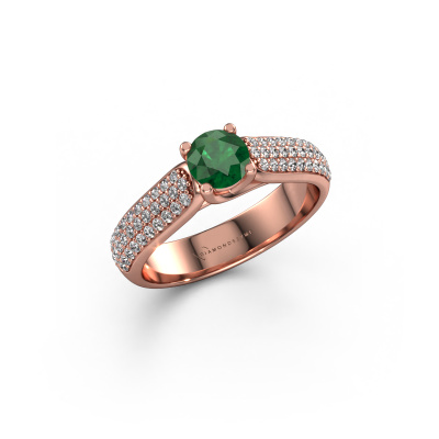 The ring shown above is called the Leoness. We call this type of ring a pavé solitaire ring. The center gemstone is surrounded by smaller sized stones. This 14 Carat rose gold version is set with a 5 mm round emerald center stone, embraced by smaller diamonds. What makes this classic rose gold pavé solitaire ring special is the setting of the smaller gems surrounding the center emerald, which are shaped like a beautiful flower. The surrounding pavé solitaire of stones frame the middle center stone in such a way to make it appear bigger. This type of engagement ring is also called a flower ring. It is very important that the smaller diamonds are positioned identically so there is no interference of light but perfect unity instead. Our skilled Goldsmiths get the job done. Each individual stone is carefully set by hand. During manufacturing, light fall is constantly monitored to make sure the special pavé solitaire effect is still visible. In the end you get the perfect engagement ring with a radiant emerald gemstone centerpiece. You can imagine the effect of a ring of such significance when you give tot the love of your life on her special day to shine. This jewel is unique in every way! Simply customize to your liking,By using our modern techniques, we can design and customize the finest quality jewels with the utmost care for you. Our engagement rings are always priced 30 percent lower than other jewelers. We make engagement rings to order so we don't have to maintain a large stock. If you have a certain budget, we are more than happy to advice you accordingly.Have you found a specific engagement ring somewhere which you would like to give to your loved one? Please feel free to express your wishes to our jewel designers because we would be honored to turn your design into a classic engagement ring. You can follow the development of your ring design because we use 3D drawings. This gives you a realistic preview of how your design will look. You can also preorder a dummy. A dummy is a plastic ring, which can be shaped according your ring design. You can try it on and check if its width and size are suitable for you. We will gladly send you a non-binding offer, based on a fair price/ quality ratio. It will amaze you, considering the quality of the ring and gemstones.To make it easier for you, we offer a 30 day return policy. Check our terms and conditions.