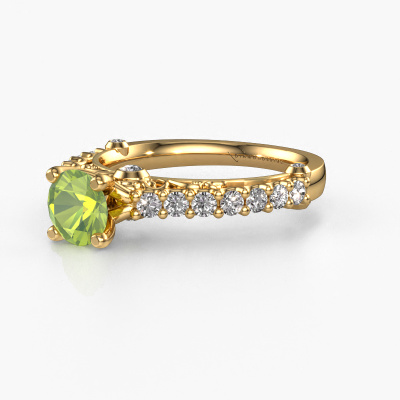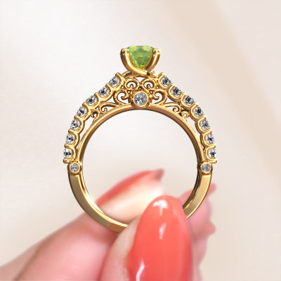 This 14 Carat gold ring is called Shaunda and is set with 6 mm peridot. For you, there is only one person in your life who stands out in a crowd. Only one that makes your heart skip a beat. A true gem! She, above all others, deserves a special gift. A unique customized jewel made in her honor. We believe this ring is perfect for your special moment. Each detail of this exclusive gold pavé solitaire engagement ring is selected by hand, crafted and polished by our expert goldsmith in our own artisan studio. We strive to achieve the perfect design and composition of the ring, so it enhances the unique features of our peridot, and lets them shine even brighter. It takes a lot of precision to make but in the end it pays off because of the sheer beauty of the ring. And that is our main goal. It's what gets us excited. The great thing about our online tool is, that you can design your own jewelry into a unique, personalized piece. This unique special engagement ring is created with the precious metal combination of gold and gold. But of course you are completely free to select other colors. Each piece of jewelry is made to shine bright around your finger. Each jewel is hand made with love by our goldsmiths.By using a combination of the latest modern techniques, combined with ancient crafting, we can make all our engagement rings in our own studio. Each jewel is made to order. This is advantageous because we can offer you a price you won't find anywhere else.Our designers and goldsmiths work together each day, creating new jewels. Perhaps you have found a nice vintage engagement ring somewhere, which can be used to customize your unique ring. Please feel free to contact us. We will make you an offer, based on a fair price/ quality ratio, which will amaze you.To make it easier for you, we offer a 30 day return policy. Check our terms and conditions.